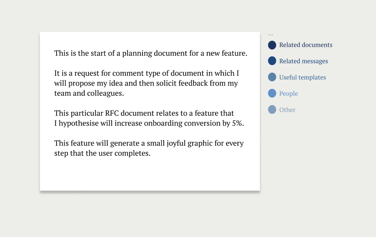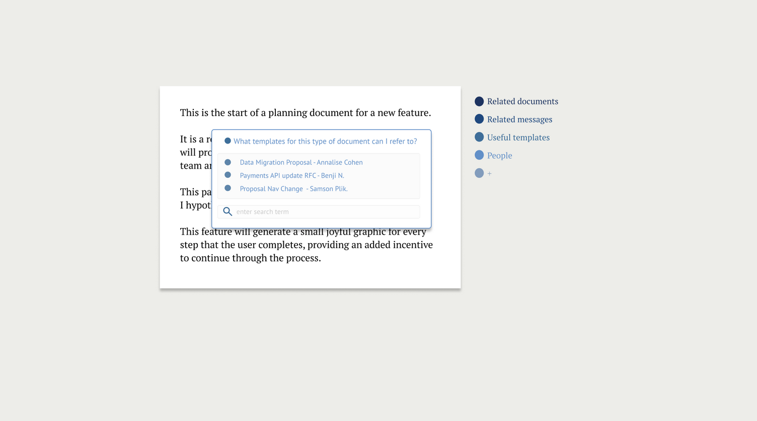 This design is part of the same flow - by selecting an option the user could generate a pop up modal that contains related document snippets, links and people that are also working on similar items as needed. The user could then easily insert a backlink within their own document as a reference or citation.